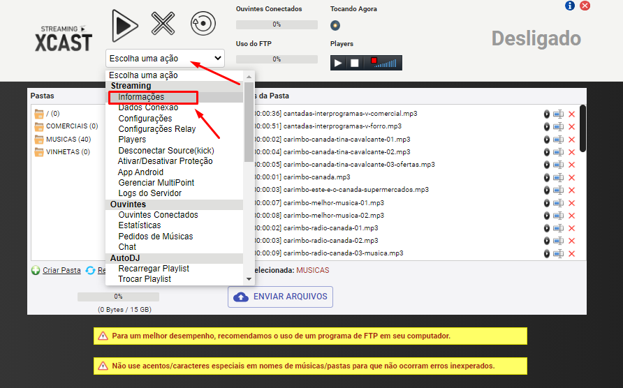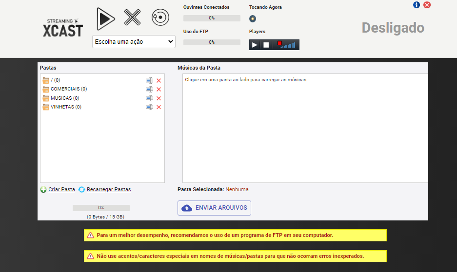 - Crie pastas para subir seus arquivos de áudio, exemplo: MUSICAS, VINHETAS, COMERCIAIS.