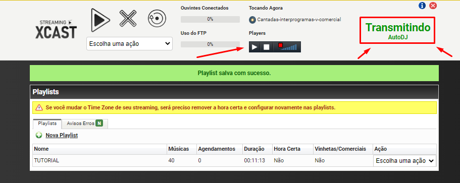 - Após feito isso, verá que o servidor já está com status TRANSMITINDO AUTODJ. Para monitorar do painel mesmo o que está sendo tocado no ar, clique no play do player preto ao lado do status.