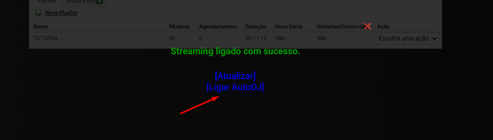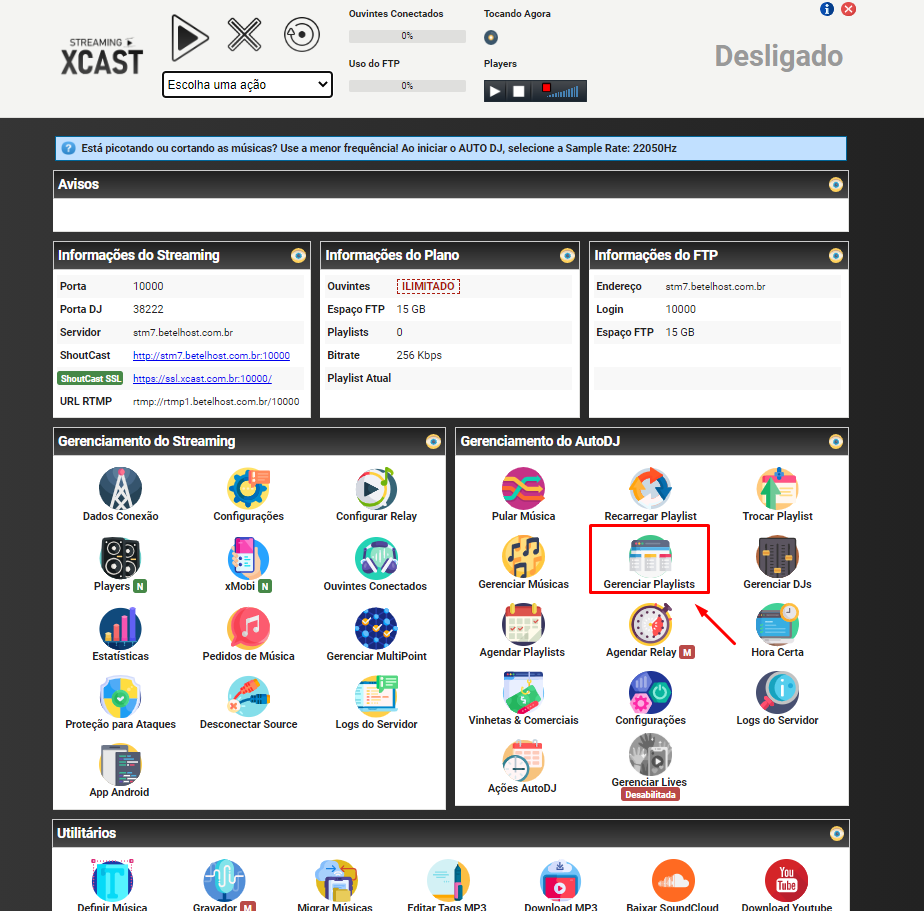 Olá, vamos aprender como se ativa o autodj do seu servidor de streaming, bem como já criando a playlist do zero. Pois verá que de início seu servidor estará desligado, então, vamos ligar. 🙂