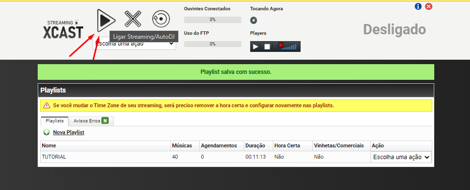 - Após feito isso, já pode subir o seu servidor de streaming para colocar a rádio no ar, clique sobre o botão de play do topo do painel.