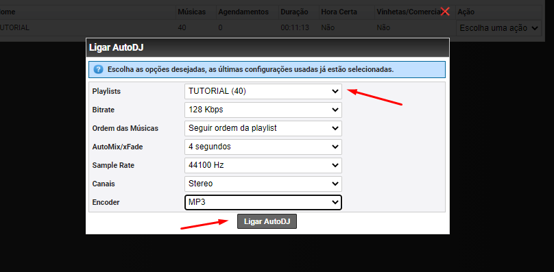 - Clique em “Ligar AutoDJ”