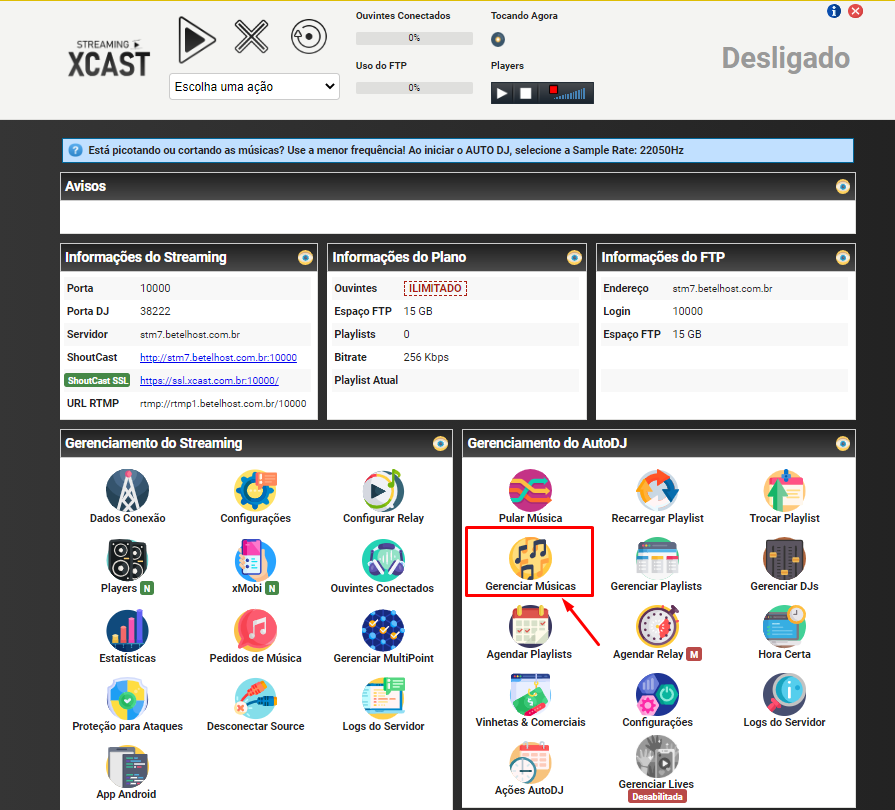 1º – Acesse seu servidor de streaming com PORTA e SENHA recebida em seu e-mail de cadastro, após acessado, vá em GERENCIAR MUSICAS.