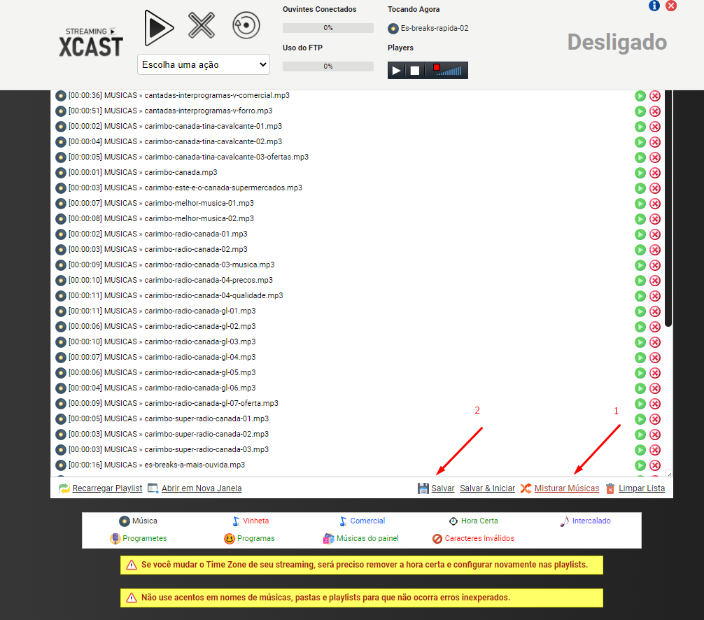 OBS.: O botão MISTURAR antes do botão SALVAR, serve para não deixar o mesmo cantor repetindo na sua programação, caso seus arquivos musicais sejam renomeados com um padrão